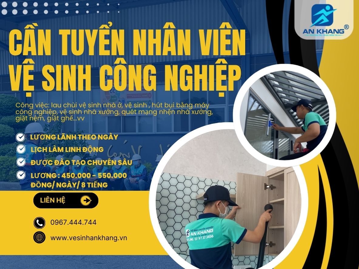 Trong bối cảnh nhu cầu vệ sinh nhà ở – vệ sinh công nghiệp – vệ sinh nhà xưởng – tổng vệ sinh công trình tăng mạnh trên toàn quốc, An Khang Clean mở rộng đội ngũ và cần tuyển thêm nhân viên vệ sinh công nghiệp làm việc lâu dài. Nếu bạn đang tìm một công việc ổn định, thu nhập tốt, môi trường thân thiện và có cơ hội học nghề chuyên sâu, đây chính là cơ hội dành cho bạn.